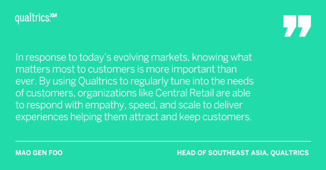 “In response to today’s evolving markets, knowing what matters most to customers is more important than ever. By using Qualtrics to regularly tune into the needs of customers, organizations like Central Retail are able to respond with empathy, speed, and scale to deliver experiences helping them attract and keep customers,” said Mao Gen Foo, Head of Southeast Asia at Qualtrics.
