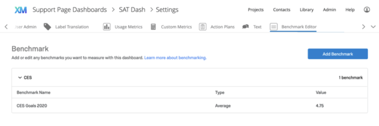 If you are new to benchmarks, you can use the Benchmark Editor to quickly upload the benchmark data you’d like to display in your dashboard. This could be your own benchmark data or XM Institute data. Simply go to the settings of your dashboard, select the benchmark editor, and click “add benchmark” then follow the workflow.