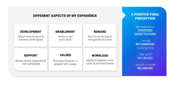 In addition to this, we also identify six dimensions known to drive a positive employee experience, underpinned by a manager effectiveness index.