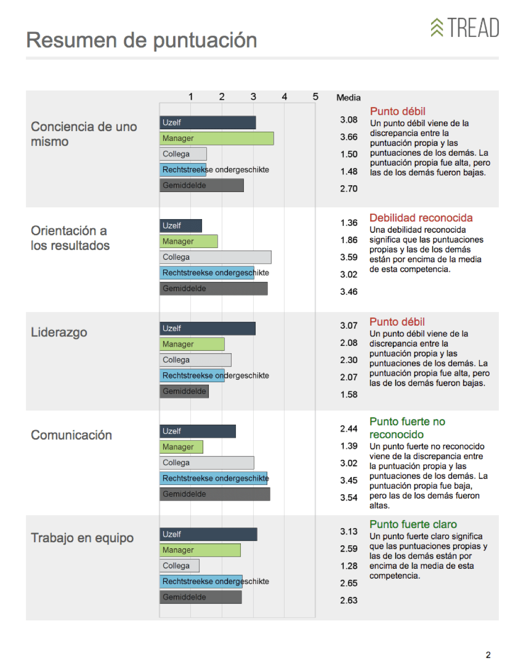 Desde allí podrás obtener más detalles. Compare la autoevaluación del sujeto con cómo lo calificaron otros utilizando un tabla de puntuaciones altas y bajas o un gráfico de brechas.