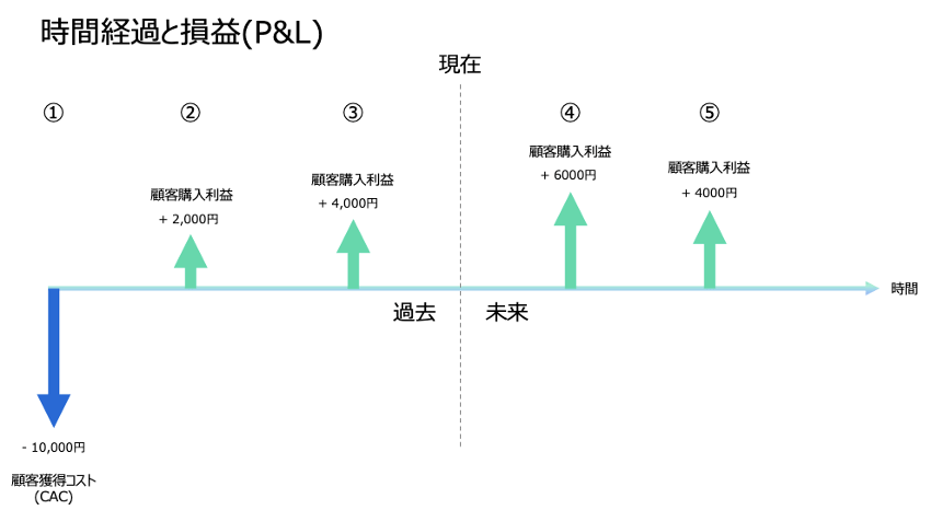 「顧客獲得コストを除いた過去・現在・未来の損益の合算値」 であり、上記の例では② + ③ + ④ + ⑤ = + 16,000円という計算となります。
