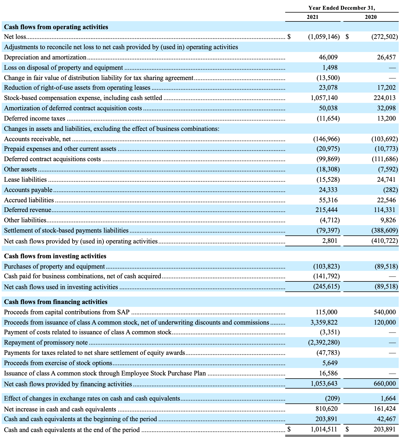 We calculate non-GAAP net loss as GAAP net loss excluding equity and cash settled stock-based compensation expense, amortization of acquired intangible assets, acquisition related costs, changes in the fair value of our distribution liability for our tax sharing agreement with SAP, and the tax impact of the non-GAAP adjustments. Non-GAAP net loss per share is calculated as non-GAAP net loss divided by the weighted-average Class A and Class B shares attributable to common stockholders.