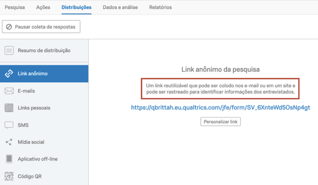 Pausar a coleta de respostas “desliga” a pesquisa para que não aceite mais novas respostas. Ninguém conseguirá iniciar a pesquisa enquanto estiver pausada. O Link anônimo será desativado e quaisquer outros links da pesquisa que você distribuiu também serão desativados (para que as pessoas que ainda não começaram a pesquisa não conseguirem respondê-la).