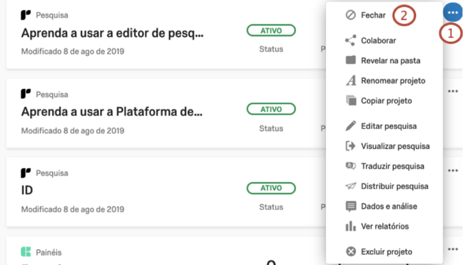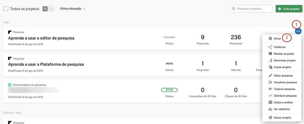 Por padrão, qualquer projeto que você criar tem o status de Novo. Isso evita que os entrevistados respondam à pesquisa enquanto ela está sendo elaborada.