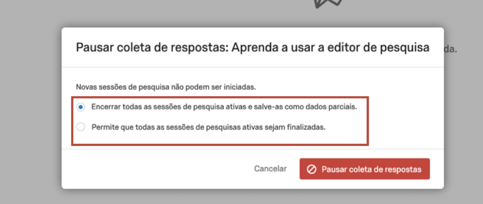 Para respostas em andamento (EN) (por exemplo, participantes que começaram a pesquisa, mas não terminaram), você pode escolher encerrar as sessões da pesquisa ou deixar que eles terminem.