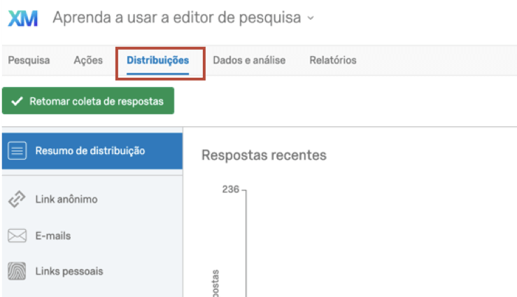 Quando você estiver pronto para começar a coletar novos dados, retome a coleta de respostas. Isso reativará o Link anônimo (EN) e permitirá a distribuição de novos links por meio do mailer da Qualtrics (EN) ou qualquer outro método de distribuição. Isso também reativará quaisquer outros tipos de links distribuídos anteriormente, desde que o entrevistado ainda não tenha concluído a pesquisa.