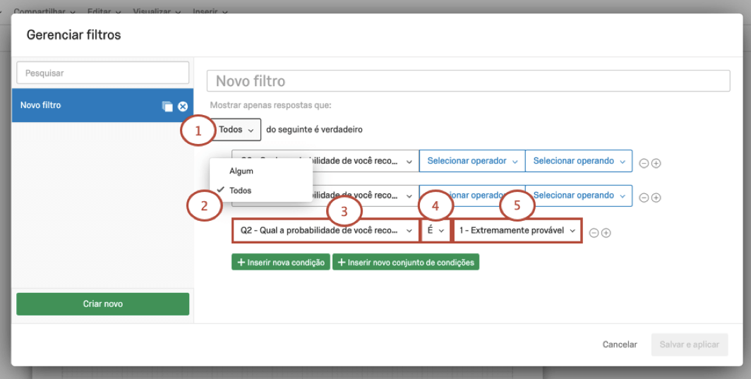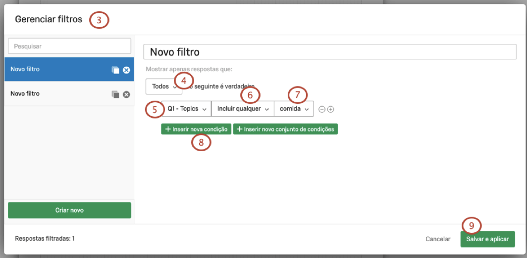 - Critérios de filtragem: Escolha entre Respostas de perguntas, Metadados da pesquisa ou Dados integrados.