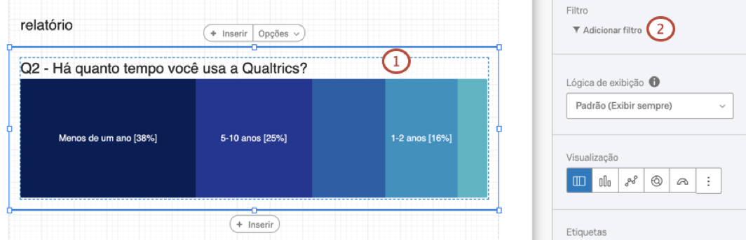 Os filtros em nível da visualização podem mudar drasticamente uma única visualização sem afetar o restante do Relatório avançado. Para aplicar um filtro de visualização: