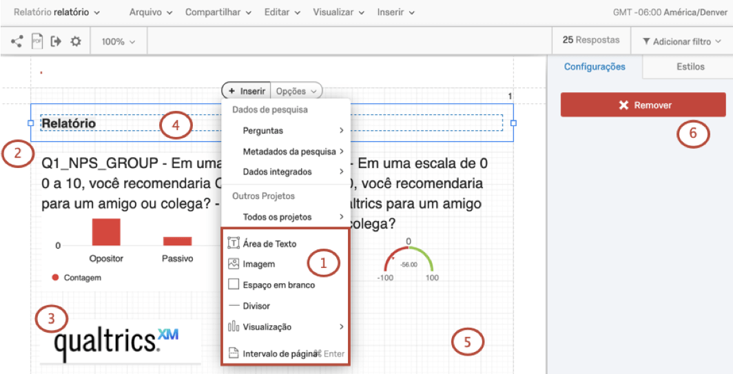 - Inserir Áreas de texto, Imagens, Visualizações, Quebras de página, Cabeçalhos e Rodapés.