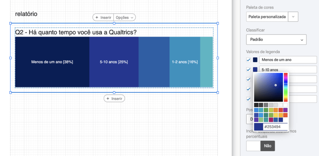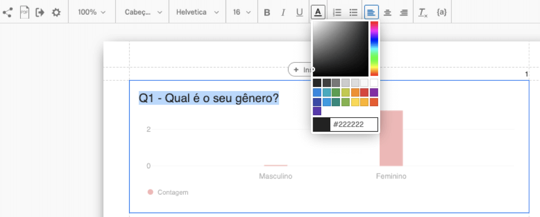- Use o Editor de conteúdo, encontrado na barra de ferramentas dos Relatórios avançados, para estilizar seu texto (por exemplo, escolha a ferramenta de cor da fonte e use códigos hexadecimais ou o seletor de cores para selecionar as cores).