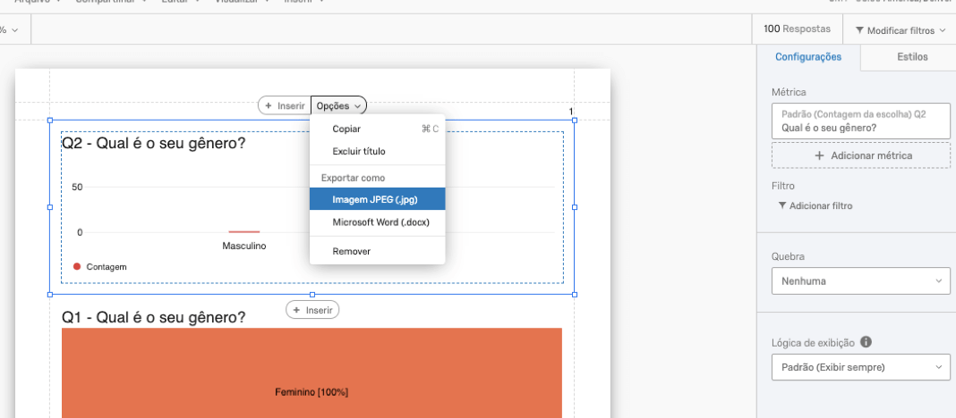Crie e compartilhe visualizações individuais ao re-estilizar as visualizações e exportá-las como Imagem JPEG (.jpg) ou Microsoft Word (.docx) nas Opções de visualização.