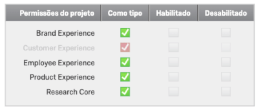 Essas permissões estão relacionadas aos próximos projetos de Experience Management da Qualtrics e serão ativadas pela Qualtrics de acordo com sua licença, à medida que forem disponibilizadas. No entanto, a permissão CoreXM (Plataforma de pesquisa) precisa ser ativada para que você possa acessar suas pesquisas da Qualtrics. Recomendamos nunca desabilitar essa permissão.