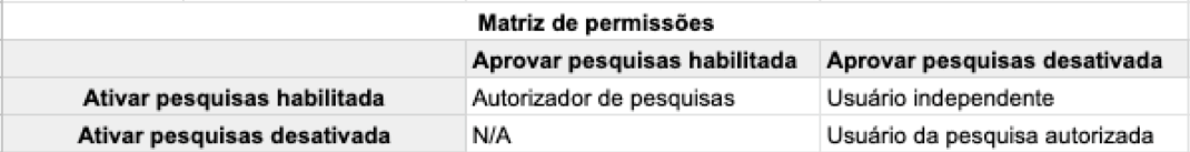 Se você quiser ter mais controle sobre os tipos de pesquisas que os usuários de sua organização enviam, você pode configurar um processo de aprovação usando as permissões Ativar pesquisas e Aprovar pesquisas. Veja a tabela abaixo para saber como configurar isso.