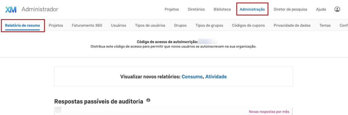 O código de autoinscrição é gerado aleatoriamente e exibido na parte superior do relatório resumido assim que a permissão é ativada para sua organização.