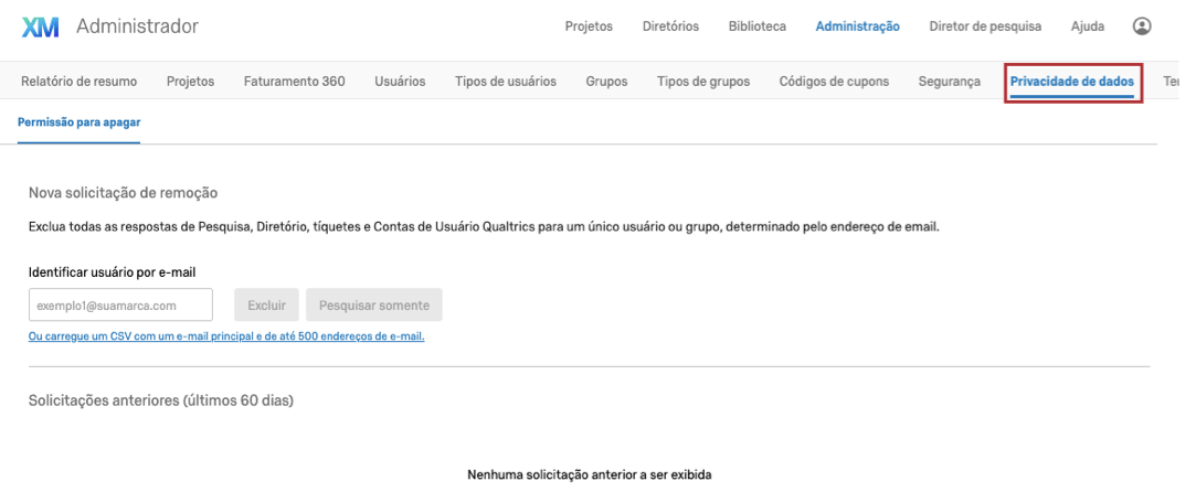 A guia Privacidade de dados está disponível para todos os administradores da marca, mas não para administradores de divisão. Ela contém a ferramenta Direito de exclusão (EN), que permite excluir todos os registros em uma marca relacionados a um endereço de email. Isso evita que os usuários precisem fazer exclusões em locais separados (contatos, tickets, respostas, etc.). Esta é uma ferramenta extremamente útil para manter a conformidade com o GDPR.