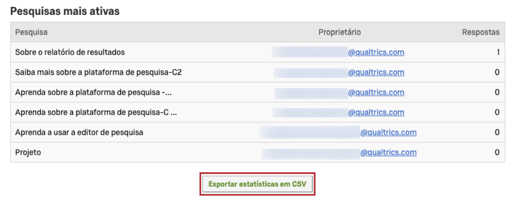 Esta seção é uma lista de pesquisas classificadas da maior para a menor quantidade de respostas recebidas. O nome da pesquisa e o proprietário serão exibidos.