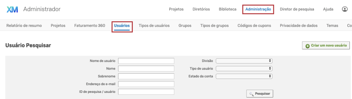 A guia Usuários permite que você crie novas contas de usuário (EN), além de pesquisar, visualizar e editar contas de usuários individuais em sua organização.