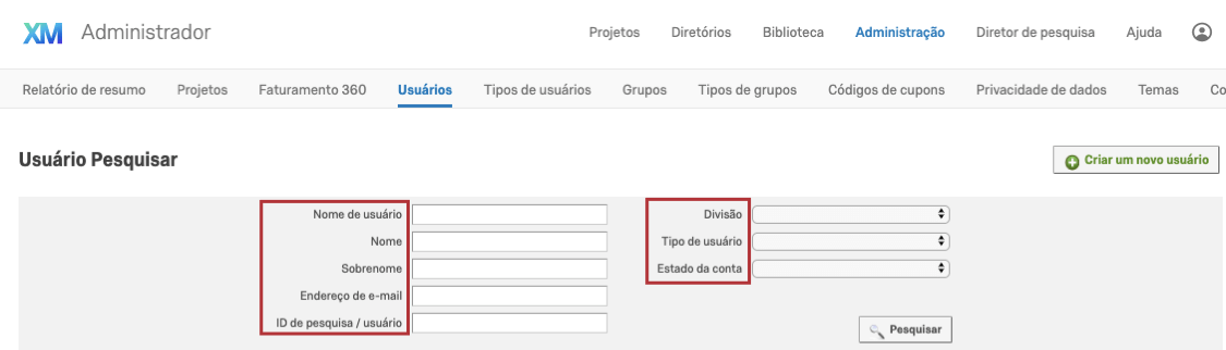 Para localizar usuários individuais em sua organização, você pode pesquisar com base em Nome de usuário, Nome, Sobrenome, Endereço de e-mail, ID da pesquisa (EN) (SV_…), ou ID de usuário (EN) (UR_…). Você também pode realizar pesquisas de usuários com base em Divisão, Tipo de usuário ou Status da conta. Você pode pesquisar usando vários campos para restringir seus resultados, se desejar.