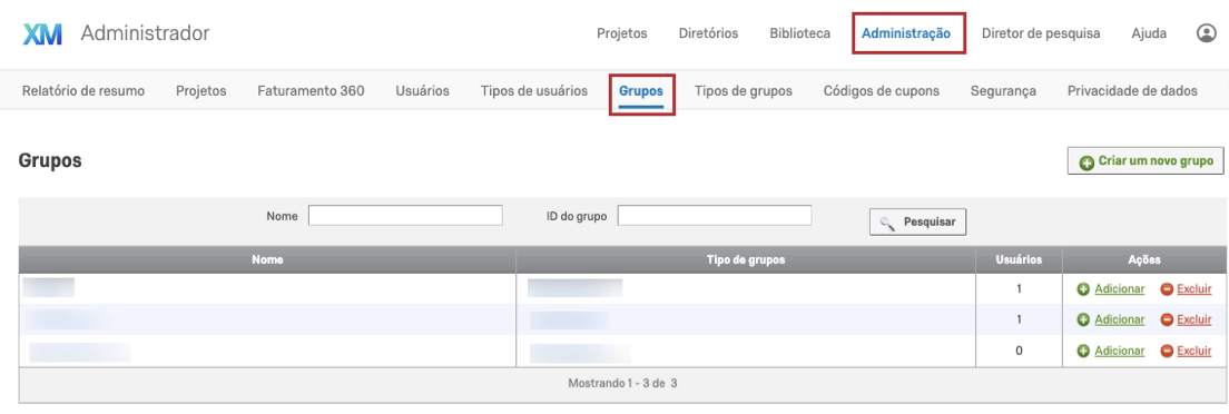 A guia Grupos (EN) permite criar, editar e pesquisar grupos de usuários. Você pode usar os grupos para criar e compartilhar conteúdo da biblioteca (por exemplo, pesquisas, gráficos, arquivos e mensagens). Você também pode usar grupos para compartilhar listas de contatos na guia Contatos. Diferentemente das Divisões, os Grupos são usados principalmente para facilitar o compartilhamento de conteúdo entre um subconjunto de usuários dentro de uma marca.
