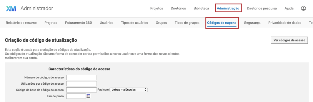 Você pode usar a guia Códigos de cupom (EN) para gerar códigos que permitem que os usuários atualizem suas permissões (EN) de conta sem o envolvimento manual.