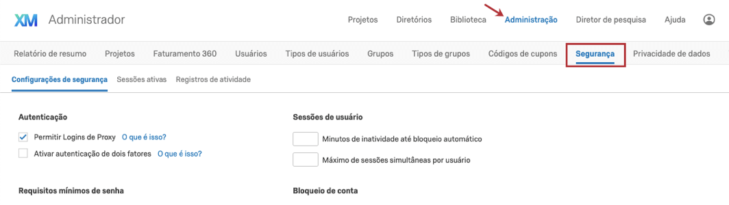 A guia Segurança (EN) é um recurso premium com configurações de segurança adicionais, como a capacidade de rastrear quais usuários estão conectados, adicionar mais requisitos às senhas, modificar quantos logins com falha levam a um bloqueio de conta e muito mais. Para saber mais sobre como você pode obter acesso a essa guia, entre em contato com seu Executivo de conta (EN).