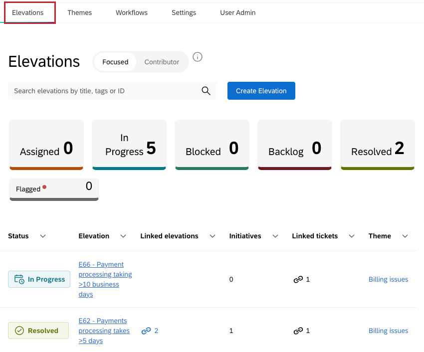 In the Elevations tab you can see a table of elevations created within your project. The content you see here varies depending on your user role. For more information on viewing and creating elevations, see Elevations in Bain Outer Loop Actions.