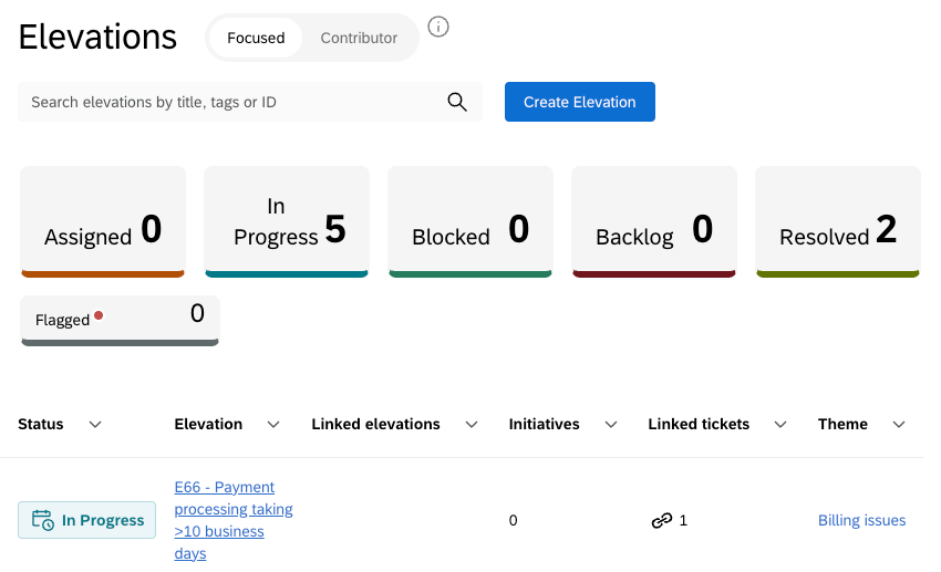 Elevations are issues that require additional attention beyond standard escalation processes for your organization. After creation, these elevations are triaged and assigned to owners to action. This may include creating initiatives to address specific elevations or groups of elevations.