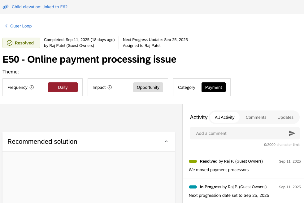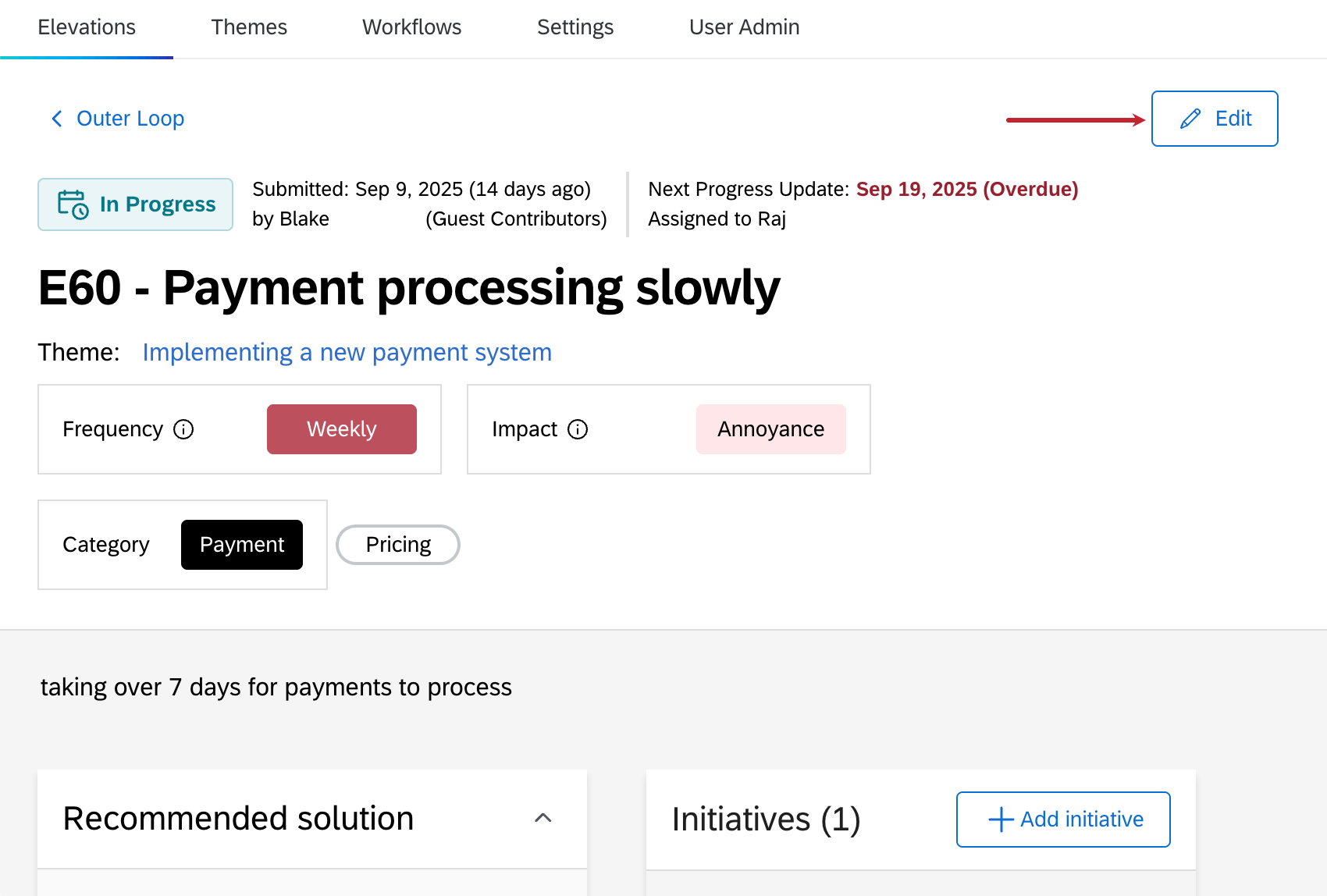 Once you are in editing mode, you can edit the elevation frequency, impact, assign a category and/or topics, edit the elevation name, or enter a recommended solution.
