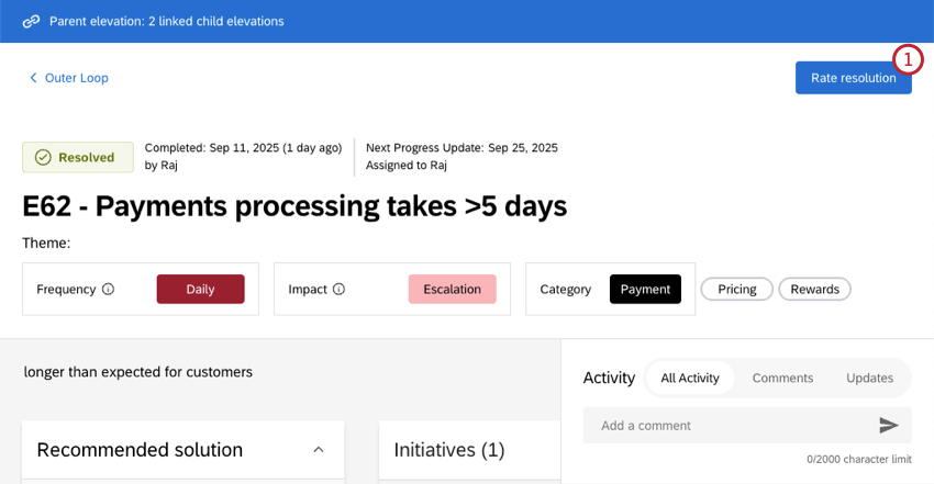 After an elevation has been given the status Resolved, you can rate the resolution. This option is only available to the Contributor user persona.