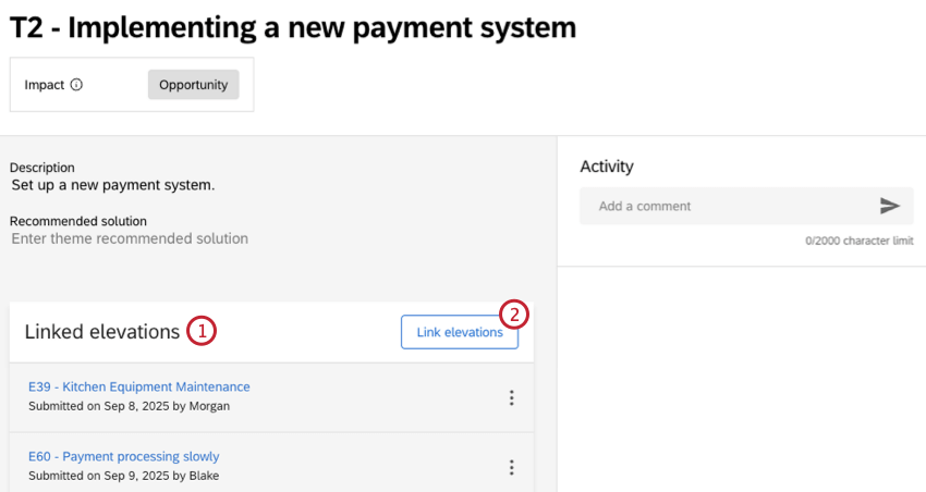 Themes allow users to group related elevations under common categories, making it easier to identify patterns. Multiple elevations can be linked to a single theme, which can highlight recurring issues, display their impact, and help prioritize resolution efforts.