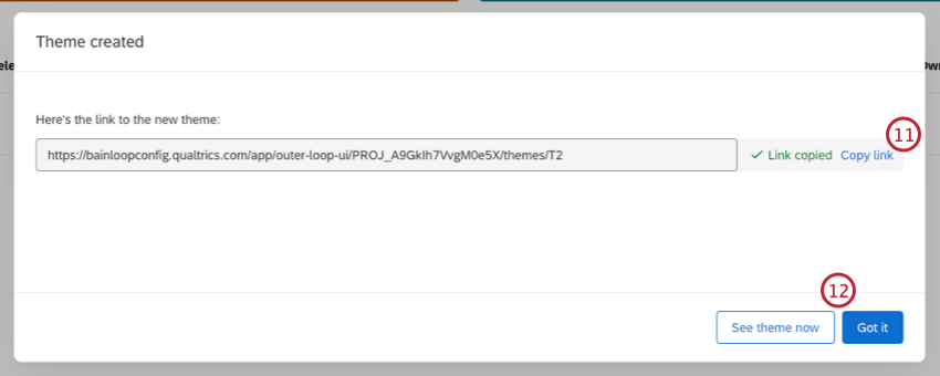 - After your theme is created, click Copy link to save a link to the theme. You can also access it by going to the Themes tab.