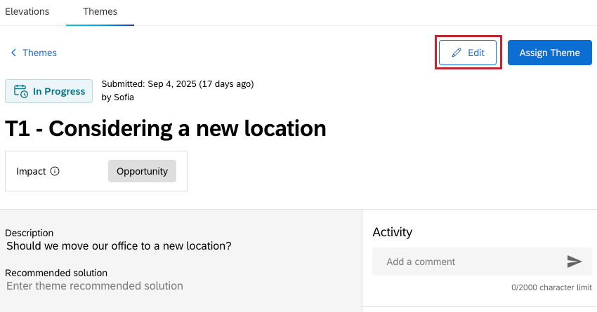 Once a theme has been created, you can edit any details by clicking Edit in the top right corner of the individual theme view. This includes editing the name, status, impact, and more. This option is only available for the Triager and Owner user persona.