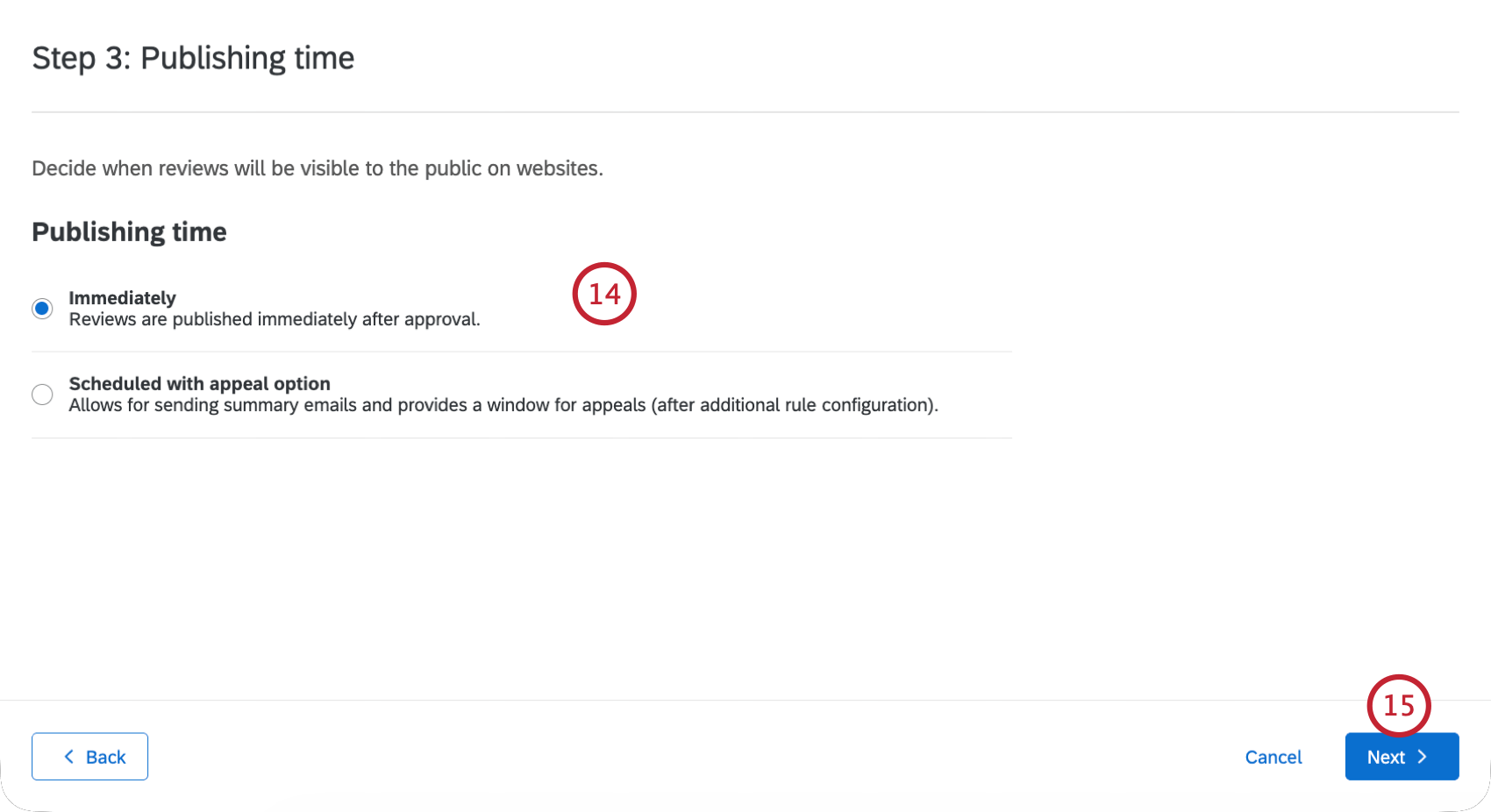 Qtip: The review will be instantly published if the “Publishing” setting is set to “Immediately.” If this setting is set to “Schedule with appeal option,” then the timeline for publishing is different. When the status is changed to “Approved,” the review will be included in the next review email, which is determined by the schedule you set. Then, any reviews that were not appealed will be published when the next email is sent.