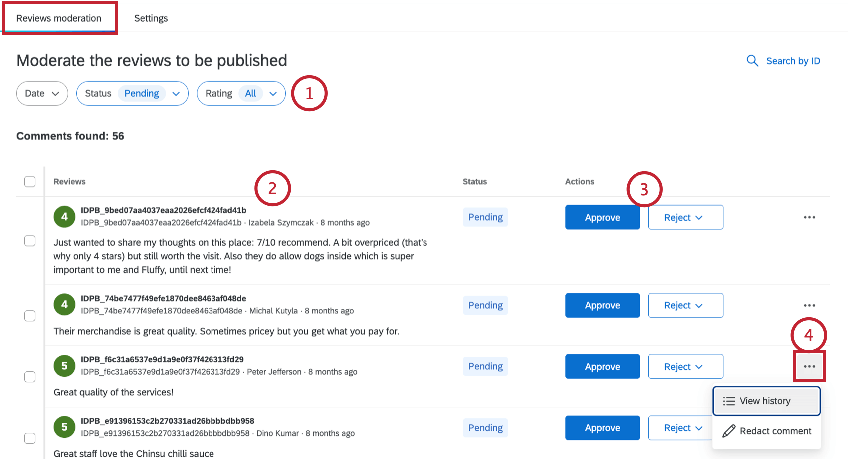 - Use the filters and search bar to find the review you’re interested in. You can filter by review date, status, rating, or search directly by review ID. Additionally, any custom fields will be available as a filter here.