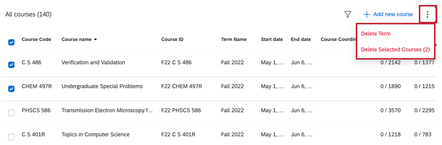 To delete a course, select a course or courses using the checkboxes, then click the 3 vertical dots and select Delete Selected Courses. Everything associated with the course will be removed, such as survey links, student enrollments, and teacher enrollments. You can also select Delete Term to delete all data associated with a specific term.