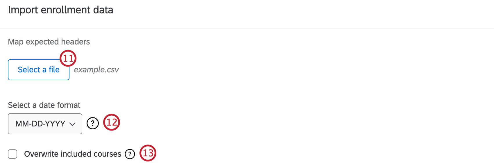 - If desired, select Overwrite included courses. This will delete all enrollment and embedded data information not included in this file for the courses you are uploading. Any data that exists in the directory for these courses but not included in the file will be deleted.