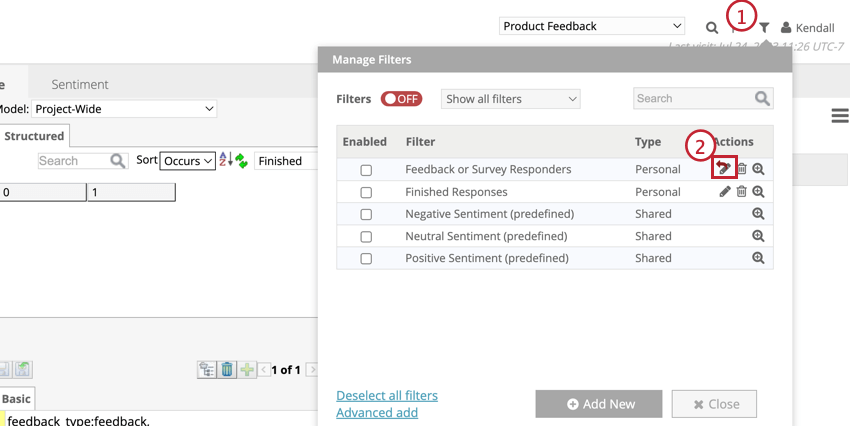 - Klicken Sie auf das Bleistiftsymbol weiter dem Filter, den Sie ändern möchten. Dieses Symbol sieht anders aus, wenn Sie einen erweiterten Filter bearbeiten.