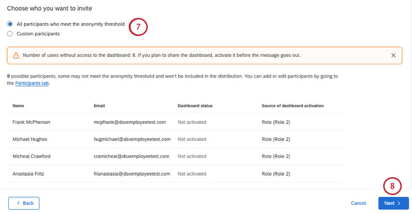 - All participants who meet the anonymity threshold: Choosing this option will send the message to all participants in the project who meet the anonymity threshold. The message will send to any eligible participant who has a dashboard permission added, even if the dashboard is not yet activated.