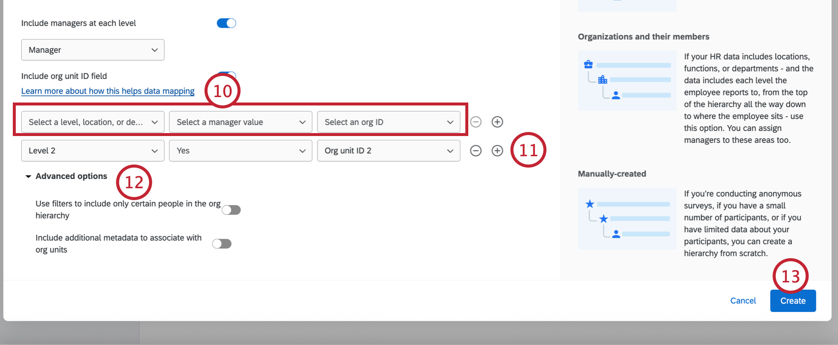 Click Advanced options when creating a level-based hierarchy to change the following settings:
