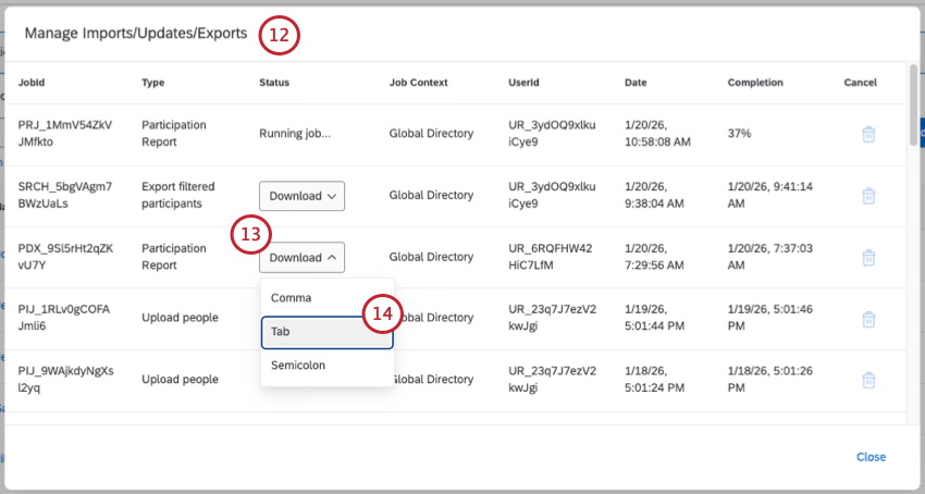 For any participant export jobs, you can click Download to download the exported participant list to your computer. Files can be downloaded in comma, tab, or semicolon separated formats.