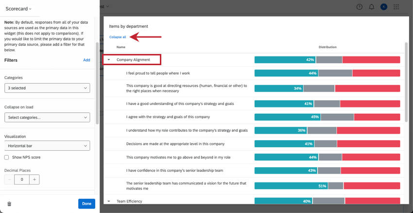 Cuando el tarjeta de puntuación muestra categorías, se muestra el rendimiento general de la categoría, con preguntas de categorías individuales anidadas debajo. Haga clic en la flecha o en el nombre de una categoría para expandir y contraer los elementos debajo de ella. También habrá una Expandir todo / Contraer todo botón en la parte superior del widget.