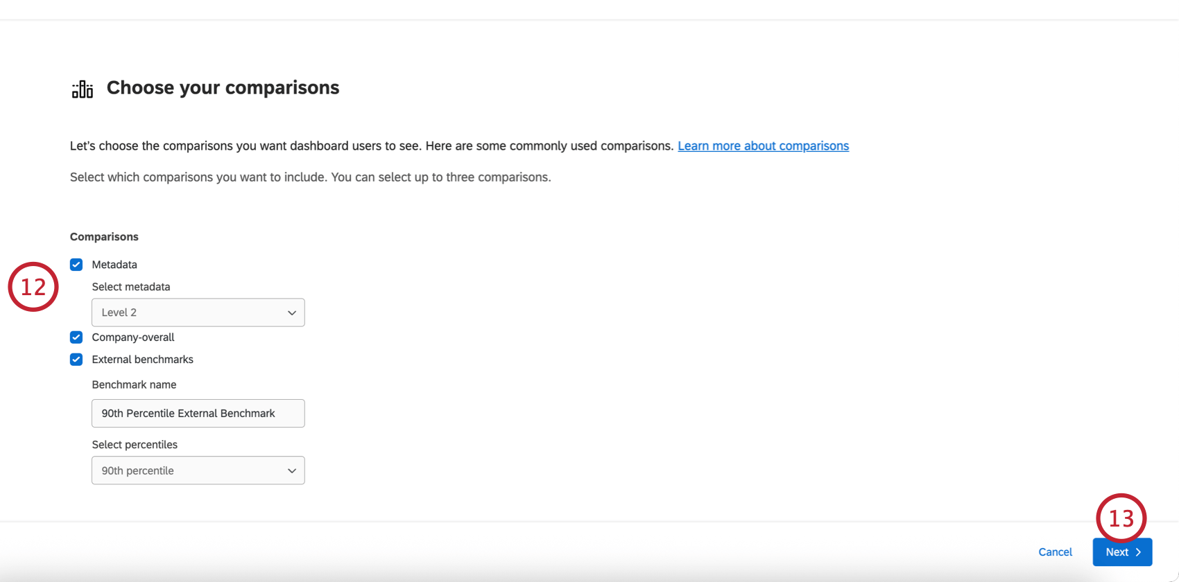 - Choisissez les comparaisons que vous souhaitez voir figurer dans votre tableau de bord :
