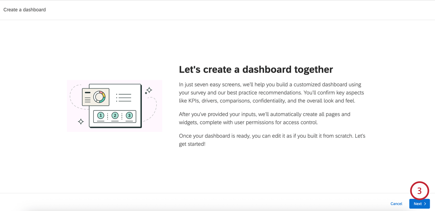 Besoin d’aide pour créer un tableau de bord Engage à partir de zéro ? Consultez les conseils fournis dans le produit pour vous aider à démarrer. En répondant à quelques questions courtes, Qualtrics construira pour vous un tableau de bord d’Engage début basé sur la méthodologie Qualtrics EX25. Vous pouvez ensuite personnaliser ce tableau de bord en fonction des besoins spécifiques de votre organisation.