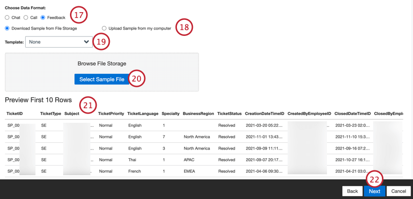 - Un aperçu du fichier s’affiche. Si vous voyez un message d’erreur ou le contenu d’un fichier brut au lieu de l’aperçu, il se peut qu’il y ait un problème avec les options de format de données que vous avez sélectionnées. Consultez la page Erreurs dans les fichiers échantillonspour obtenir de l’aide sur le dépannage de votre fichier.