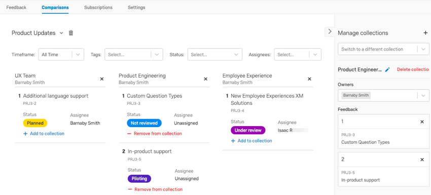 Comparisons and collections are used to organize feedback requests so that they’re easier to track and action. The Comparisons tab allows you to see feedback side-by-side to help you prioritize how to action upon feedback. You can create collections to group similar feedback requests, such as grouped by your different products.