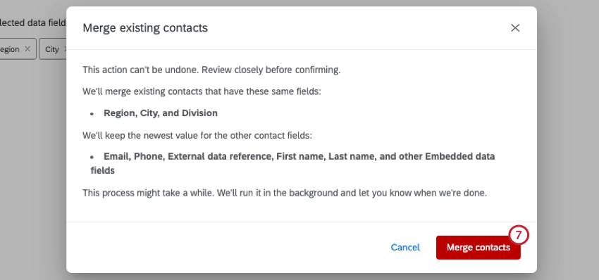 Qualtrics will then merge any duplicate contacts in your directory based on your specified rules. The run time can vary depending on the number of contacts in your directory. When merging duplicate contacts, there is a limit that each set of duplicate contacts must have less than 500 contacts. If there are more than 500 contacts in 1 set, the job will fail. To prevent this, you can manually delete contacts until you have less than 500 in each deduplication set.