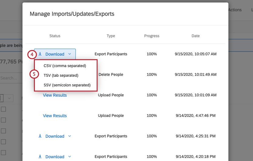 - Al termine, fare clic su Download e selezionare il formato di esportazione desiderato (CSV, TSV o SSV). È quindi possibile aprire questo file nell’editor di file di propria scelta (ad esempio, MS Excel).