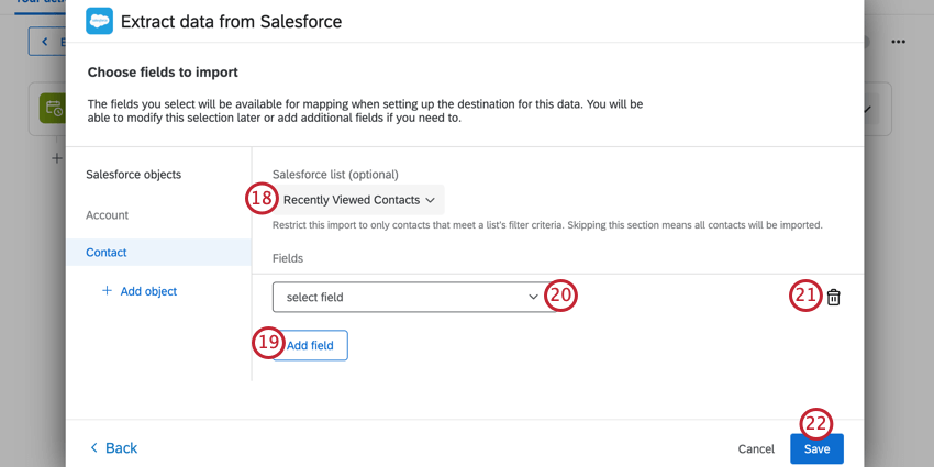Attenzione: i campi composti da Salesforce non possono essere importati in Qualtrics.Consiglio Q: è possibile mappare anche i campi di contatto personalizzati da importare. I campi personalizzati saranno disponibili nell’elenco a discesa del campo selezionato.