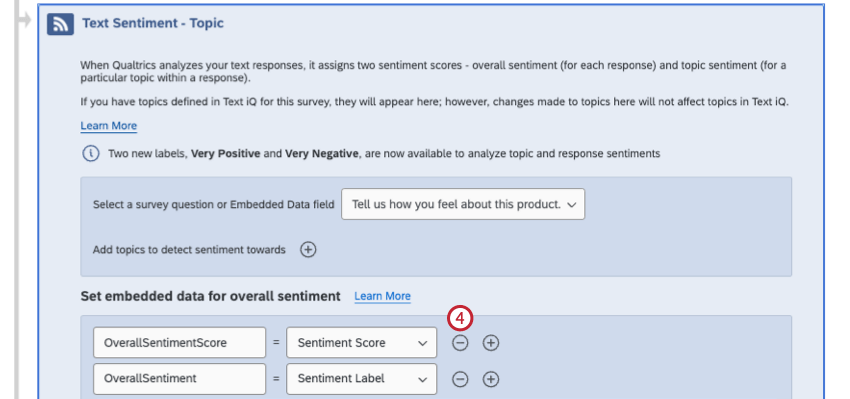 In questa sezione dell’elemento Text iQ è possibile salvare l’analisi del sentiment dell’intera risposta come campo Dati integrati. È utile se si vuole basare la logica diramazione o altre condizioni sull’analisi del sentiment della risposta.