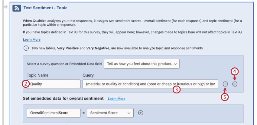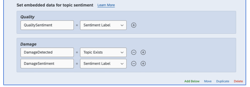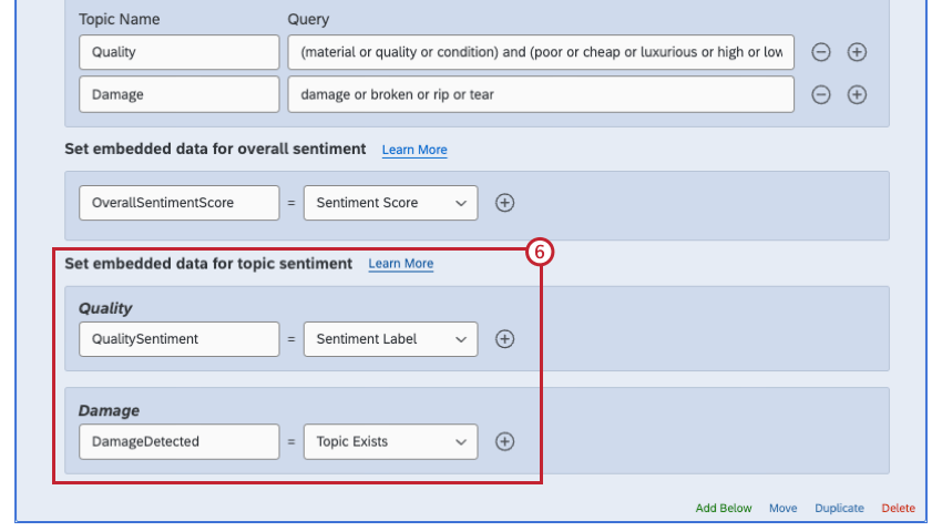 - Per ogni argomento viene visualizzata una nuova sezione che consente di impostare i campi di analisi del sentiment. Navigare qui per aggiungere dati integrati specificamente per gli argomenti creati, anziché acquisire informazioni che si applicano all’intera risposta. Qui è possibile aggiungere dati integrati che catturano quanto segue per ogni argomento: